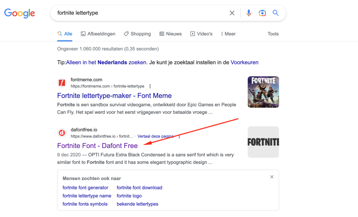 Stap 1: Je kunt op google zoeken op bijv: “speels lettertype”, “eng lettertype”, “fortnite lettertype” etc. Kijk waar je uitkomt. Uiteindelijk moet je het lettertype gratis kunnen downloaden.