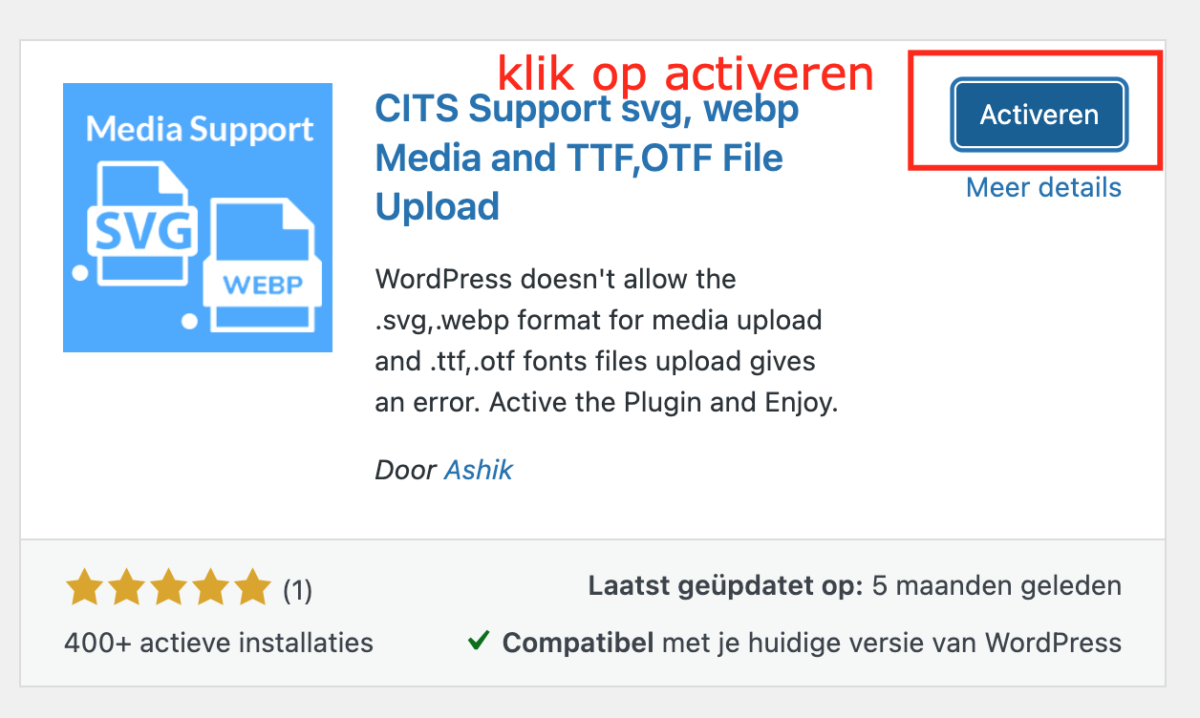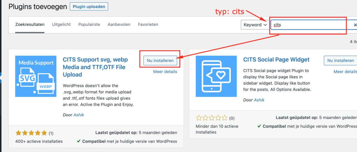 Stap 2: Typ in het zoekvakje rechts “cits”. Het programmaatje “CITS Support svg, webp Media and TTF, ORG File Upload” verschijnt. Klik op “nu installeren”